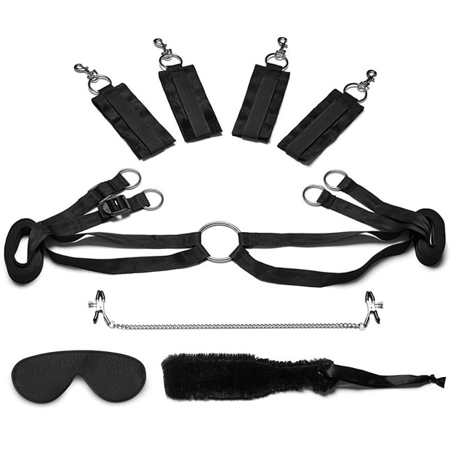 В комплекте: 4 манжеты с фиксатором на кровать, маска на глаза, шлепалка, зажимы на соски, сумка для хранения.