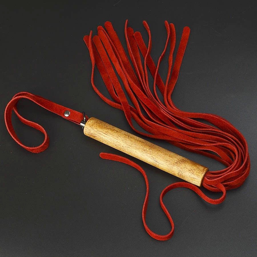 Этот предмет имеет деревянную рукоятку и ударную часть из мягкой натуральной велюровой кожи красного цвета.